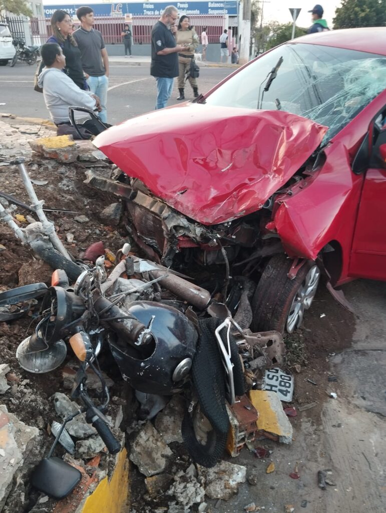 Já o condutor da moto foi encontrado ao solo, desorientado, com traumatismo cranioencefálico, agitação, confusão mental, corte profundo com intensa hemorragia na região mandibular, perda de vários dentes, diversas escoriações pelo corpo e dois cortes profundos em ambas as pernas.