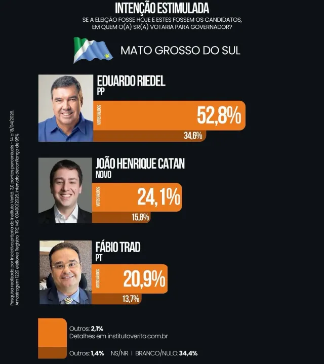O instituto ouviu 1.220 eleitores, entre os dias 14 e 18 de abril. O levantamento está registrado no TRE-MS com o número MS-00490/2026. A margem de erro é de 3% e o intervalo de confiança de 95%.