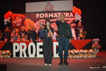 Um dos momentos mais simbólicos da solenidade foi o juramento Proerd, quando as crianças, de mãos erguidas, prometeram permanecer longe das drogas e da violência, assumindo o compromisso de serem multiplicadores das boas escolhas dentro e fora da escola.