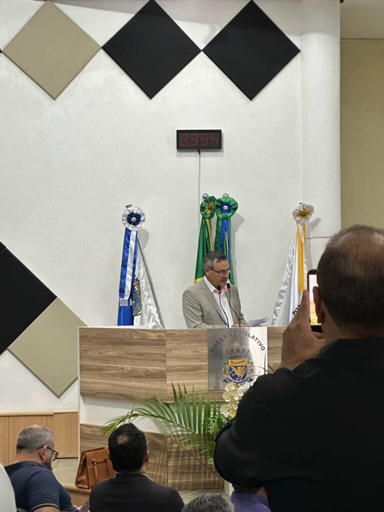 A solenidade já está em andamento no Plenário Vereador Joaquim Honório Sobrinho e foi precedida pelo hasteamento das bandeiras, realizado às 8h50, em frente à Câmara Municipal.